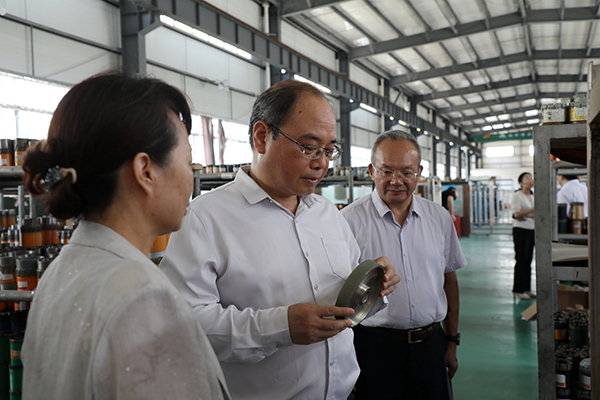 局党组书记郑杰忠(中)在金刚石公司开展实地调研,详细了解生产经营情况