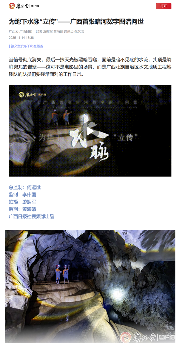 据悉,该项目最终将形成《广西岩溶地下河开发利用规划图册》,内容涵盖土地利用现状、简要地质信息、开发利用现状、地下水水质、干旱(内涝)分布、地下水开发利用方式及效果等,如同为广西地下水资源绘制了一张“全景导航图”。同时,项目还将完成8处典型地下河段的堵截可行性论证,为后续解决局部地区水资源短缺、防治内涝灾害提供科学方案。这些成果不仅填补了广西岩溶地下河系统精细化调查的空白,更将为广西地下水资源的可持续开发利用、生态环境保护提供坚实依据与精准指导,助力广西在水资源优化配置中迈出更坚实的步伐。(编辑:刘容辰;审核:苏世峰;校对:刘容辰)