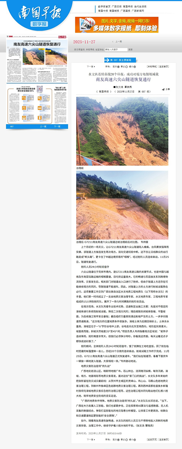 如今,随着南友高速恢复畅通,水文队的抢险人员又马不停蹄地投入到新的地质灾害排查、治理工作中,继续守护着八桂大地的平安。(张文浩 覃晓燕)