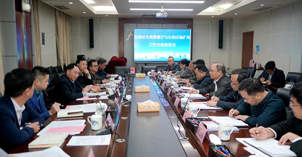 郑杰忠对黎修旦一行的到来表示热烈欢迎,并重点介绍了我局在深化综合改革中涉及矿业权管理工作的进展。他指出,全局正深入贯彻落实自治区党委、政府关于推动有色金属及关键金属产业高质量发展的决策部署,紧扣《广西关键金属产业创新发展“十五五”规划》确立的“九链三集群”目标,全力推进有色金属、关键金属矿产勘查找矿,提升矿产资源保障能力。同时,我局已全面梳理局属地勘单位持有的矿业权,建立健全资源台账,为下一步即将组建的广西地矿集团依法依规取得矿业权、实现“资源-技术-产业”良性循环提供坚实支撑和发展保障。郑杰忠表示,当前正值地矿部门综合改革关键阶段,恳请自治区自然资源厅在矿业权整合、探矿权延续等工作中给予政策指导,充分依托我局在地质勘查领域的技术优势、队伍优势和多年积累的找矿成果,协同推进新一轮找矿突破战略行动,共同为广西有色金属产业高质量发展贡献地矿力量。