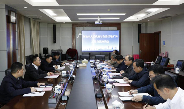 郑杰忠对邓奕红一行的到来表示欢迎,介绍了我局近年来在矿产资源勘查、基础地质调查、矿业开发、科技创新等领域的工作成效,以及积极融入南丹关键金属高质量发展综合试验区建设的进展情况。他表示,为深入贯彻落实国家新一轮找矿突破战略行动决策部署,服务保障国家能源资源安全和自治区有色金属、关键金属产业高质量发展,我局将继续深化与河池市的矿产资源开发合作,充分发挥专业技术优势,不断提升区域矿产勘查的科学化、精准化水平,共同推动河池市矿业开发向集约化、规范化发展转型,为地矿经济与地方产业协同高质量发展提供坚实支撑。
