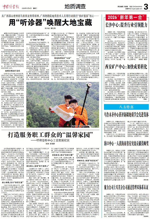 从广西深山密林到马来西亚热带雨林,从传统固体矿产到页岩气新能源,再到地热资源,物勘院一代代地质技术员用智慧和汗水,不断刷新深部找矿的纪录,拓展物探技术的应用领域。“我们将永葆对自然的敬畏与探索的热情,以匠心打磨技术,用智慧破解密码,努力在八桂大地乃至更广阔的空间,聆听大地深处矿脉的回响,为保障国家能源资源安全再立新功。”物勘院党委书记、院长廖海志望着远处群山,语气坚定地说道。