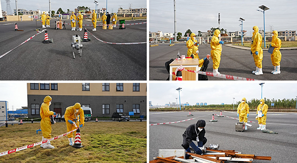 演习模拟了某纸业有限公司两枚Ⅴ类放射源铯-137在密度计更换过程中的失控事件。演练中采用“人工精准搜寻”与“智能机器狗侦察”协同作战模式。