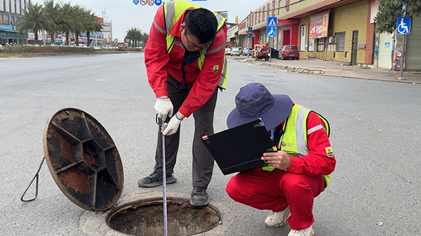 在灵山街道现场作业,技术人员通过打开下水井盖,精准排查管网现状、摸清管网“家底”